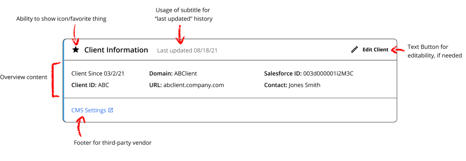 Because the platform needed to host and display a lot of data from a variety of core entities, it was important to create a template that accommodates the different type of content without the user relearning actions. Nested components were swappable based on need.