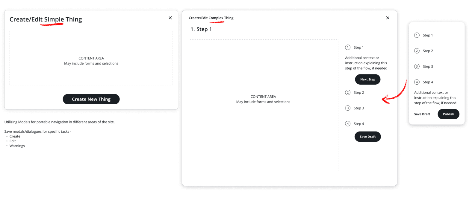 “Create and edit” actions accessible from different aspects of the website, and how would that look in the navigation. To tackle this, I put those actions in modals. This approach makes these actions “portable” in the user's navigation.