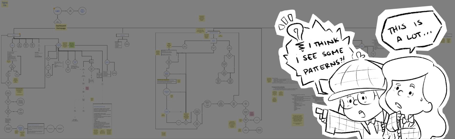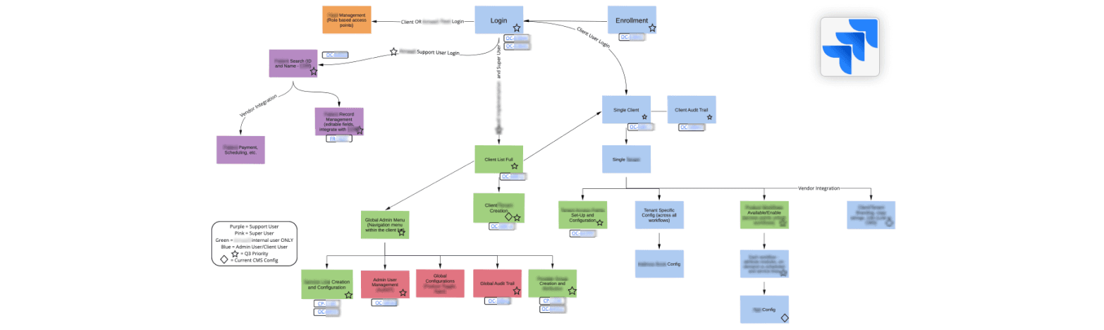 Because this platform is meant to touch all aspects of the company’s product and users, it was huge. Our PM started us designers off by gathering a butt ton of Jira tickets and laying it all out in a high level flow.