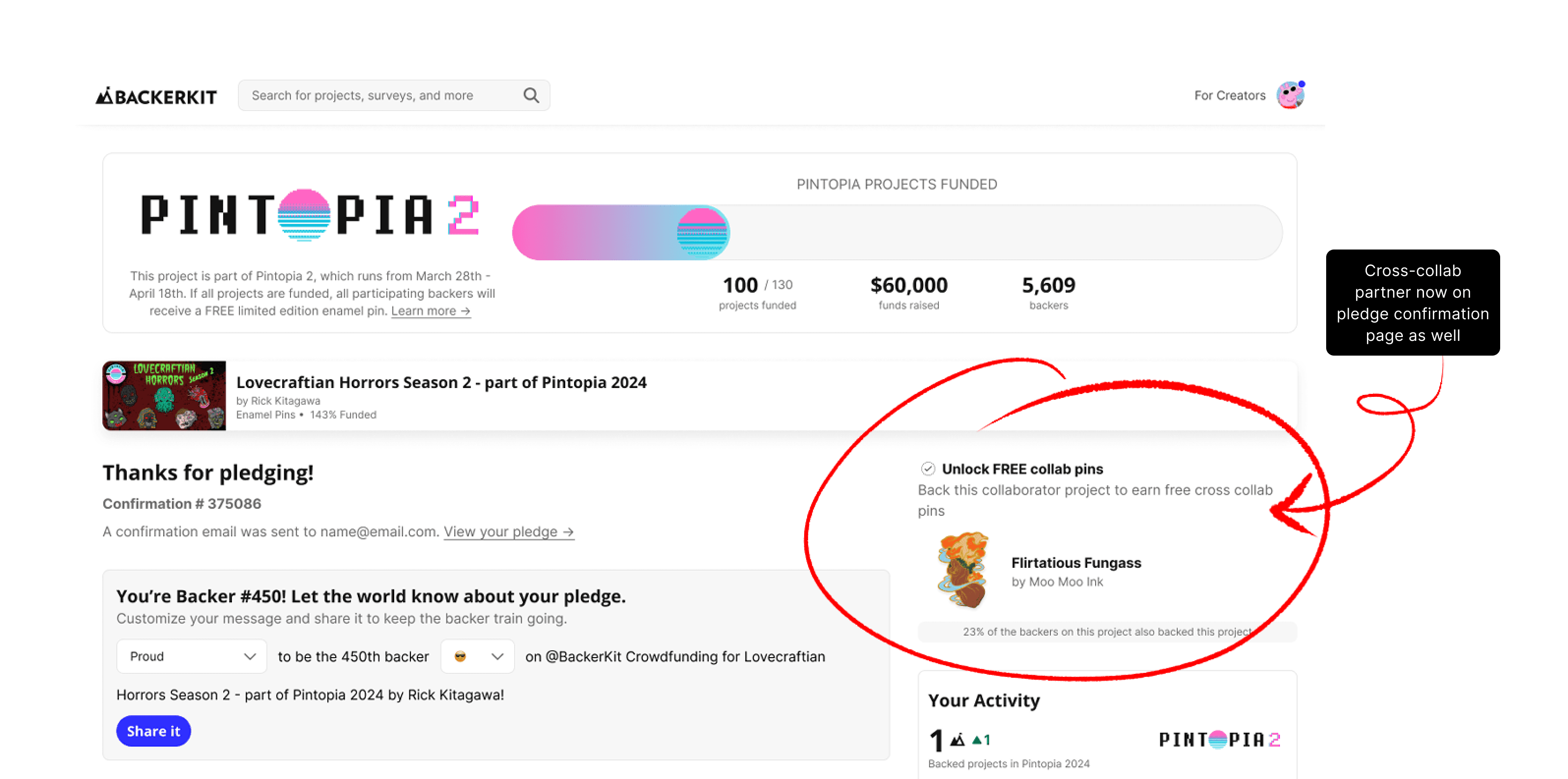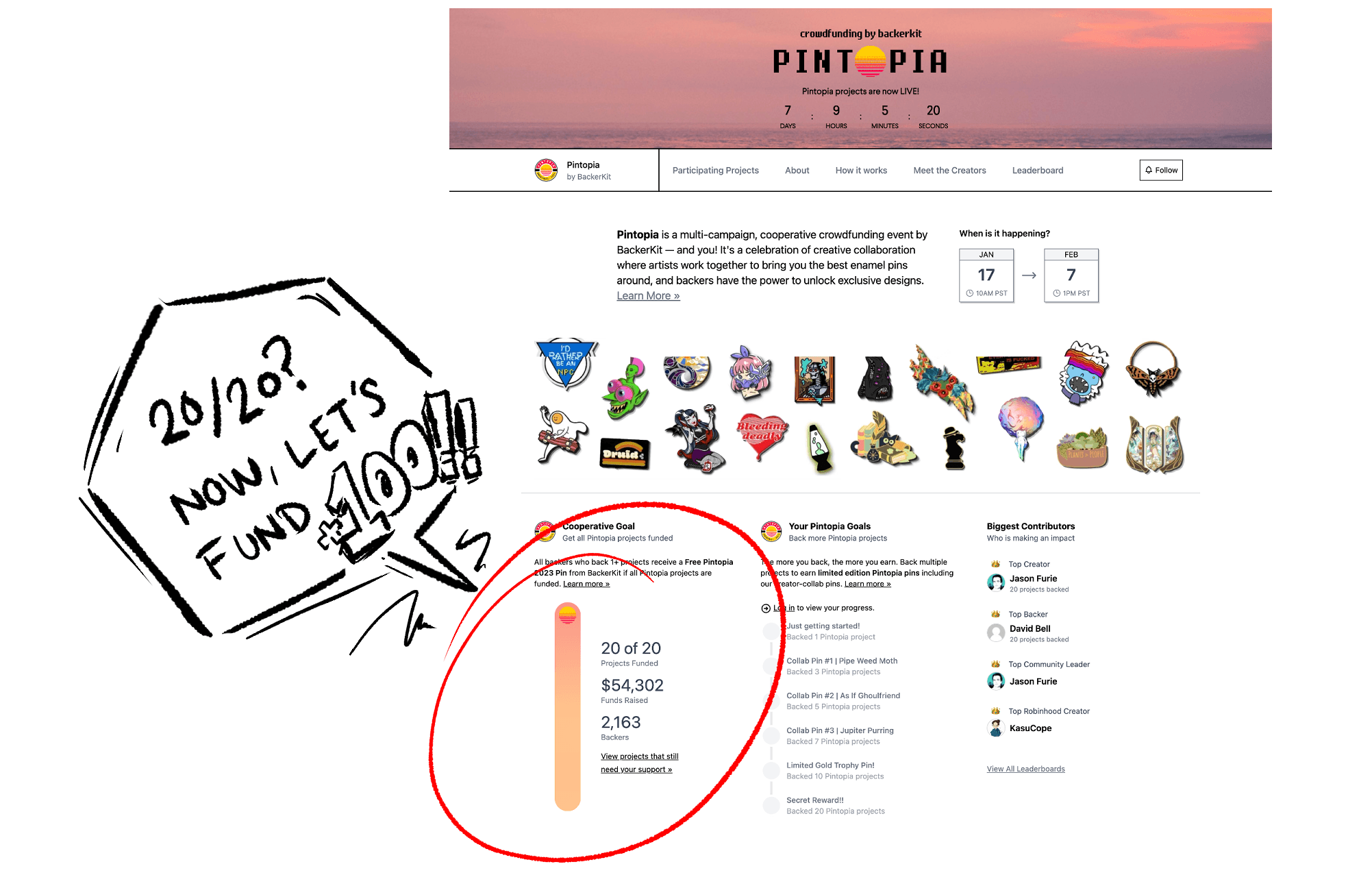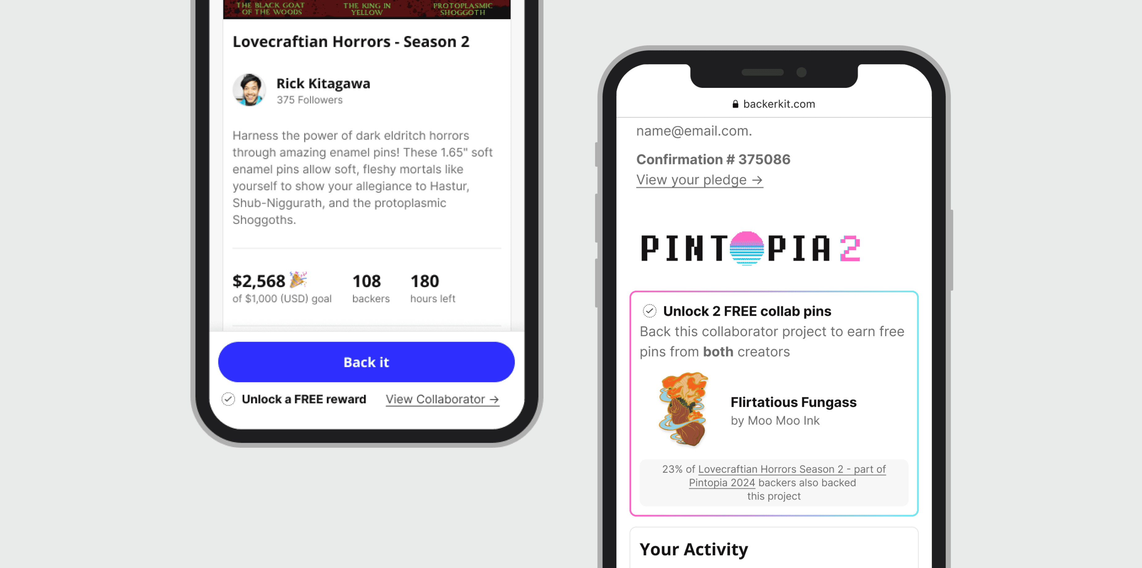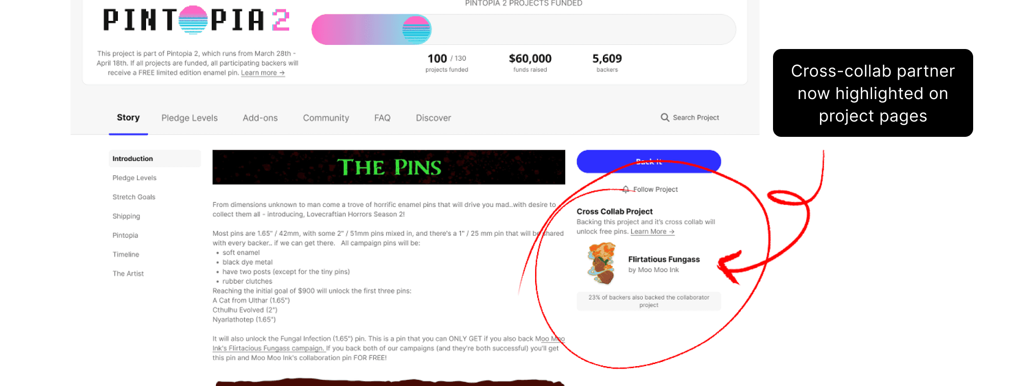 From small one-on-one cross collaboration between creators to larger big group collabs like Pintopia, this became a foundational offering that BackerKit is now able to offer creators. After Pintopia, several more group and cross-collabs launched successfully, with creators such as Key & Crow Studios and UltraInfinite each achieved their #1 most funded projects in a cross-collab, boasting an 80% overlap of people backing both projects during the collab campaigns.