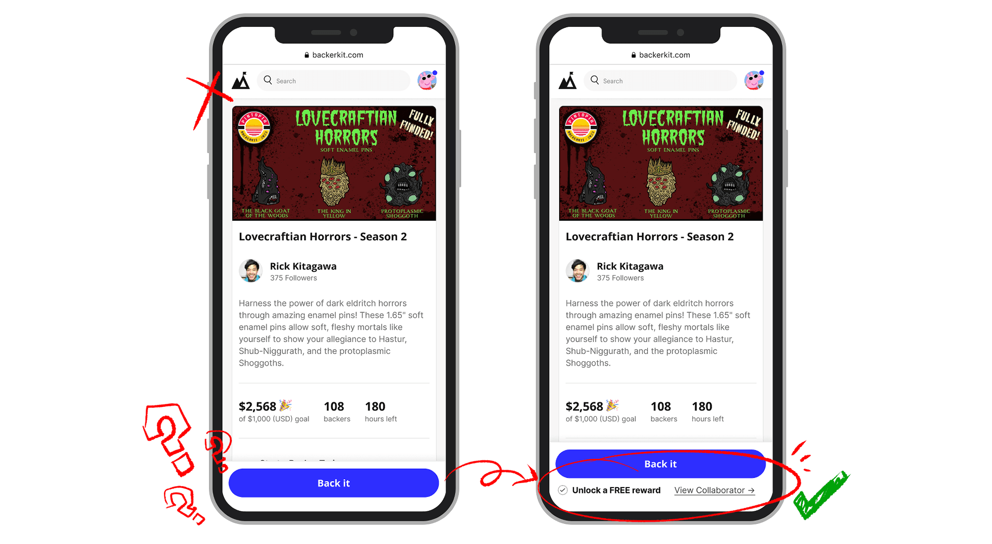 Because we were building live with creators, we received rapid feedback that we could iterate on before Pintopia launched. The mobile design I shipped hid the collaborator before the user backed the project. Creators reported that they felt the collab aspect wasn’t obvious, so I iterated on the design to showcase the collaborator on mobile while not distracting from the main CTA.